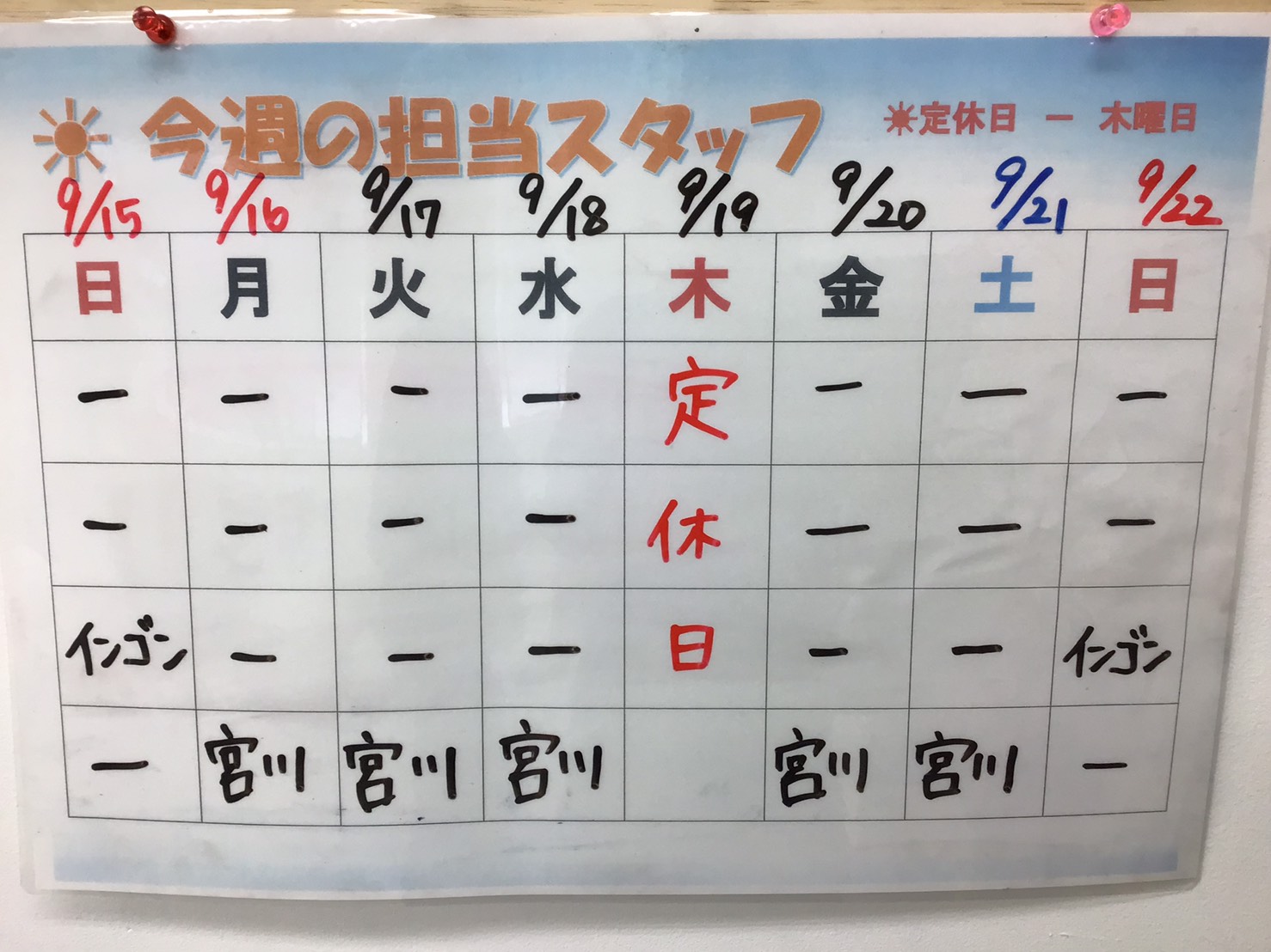 9月19日(木) 定休日